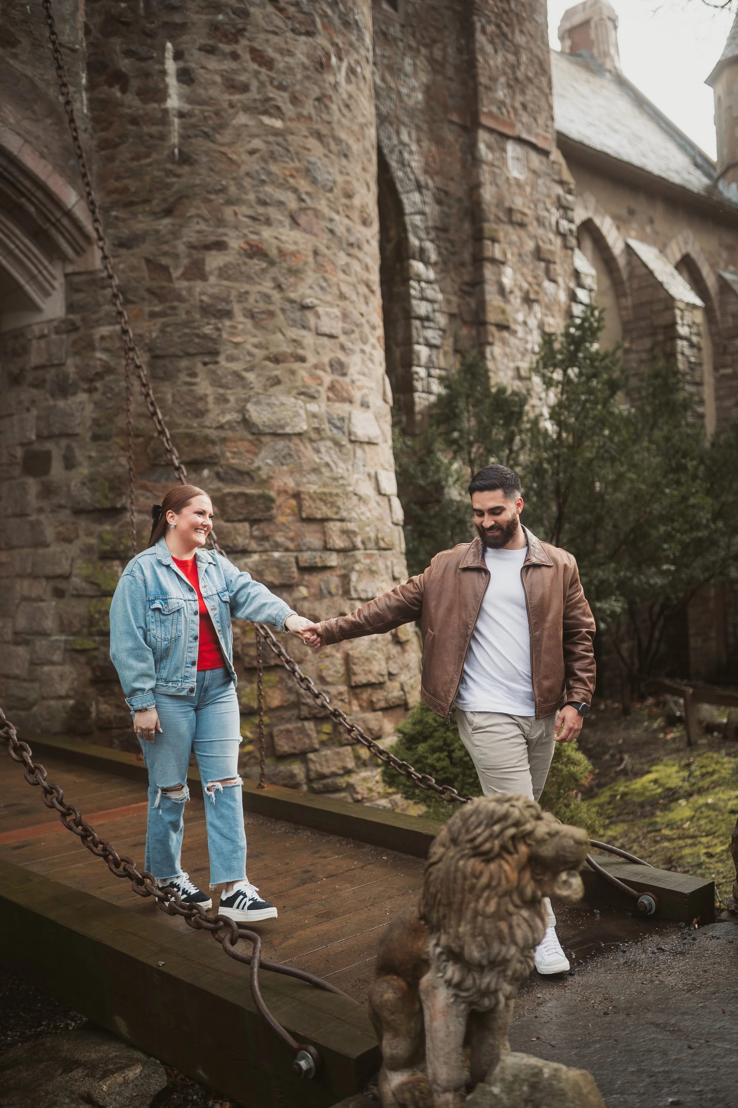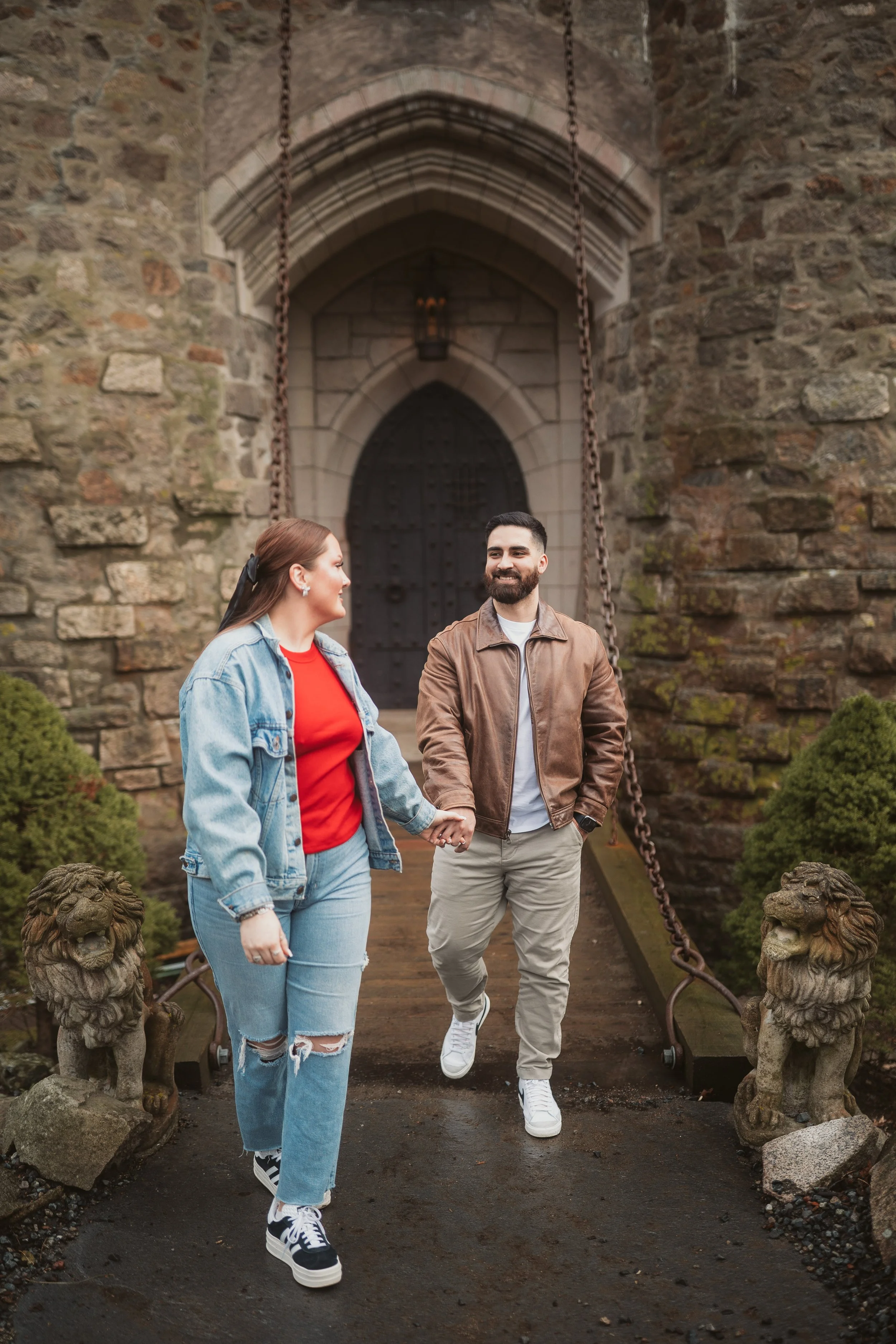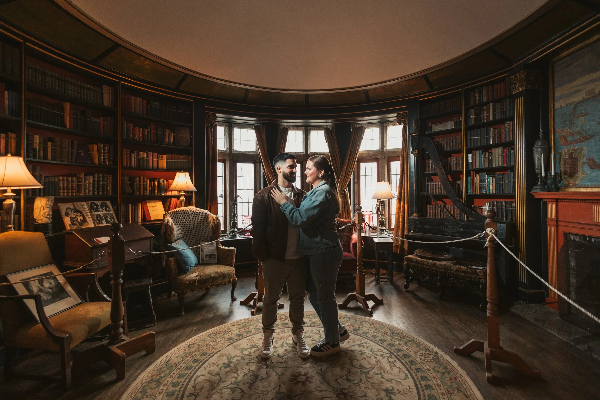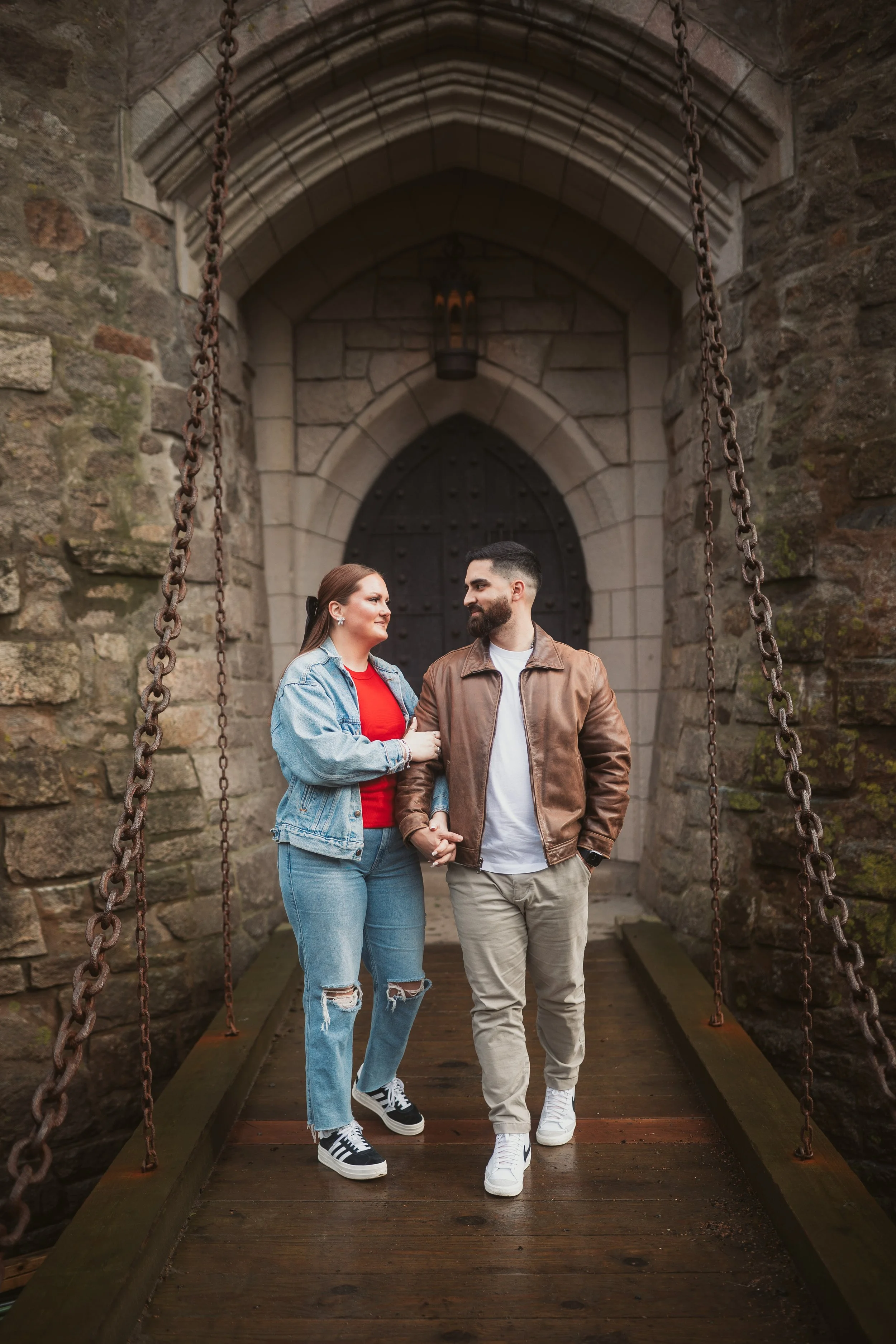 After their proposal, I took the couple around Hammond Castle for a relaxed portrait session, weaving through some of its most iconic spaces. From the stone arches overlooking the coastline to the historic drawbridge, the dramatic Great Hall, and the intimate circular library, each setting added its own sense of romance and timeless character. The experience felt natural and unhurried, allowing them to savor the moment while I captured their genuine connection within the castle’s storybook setting.