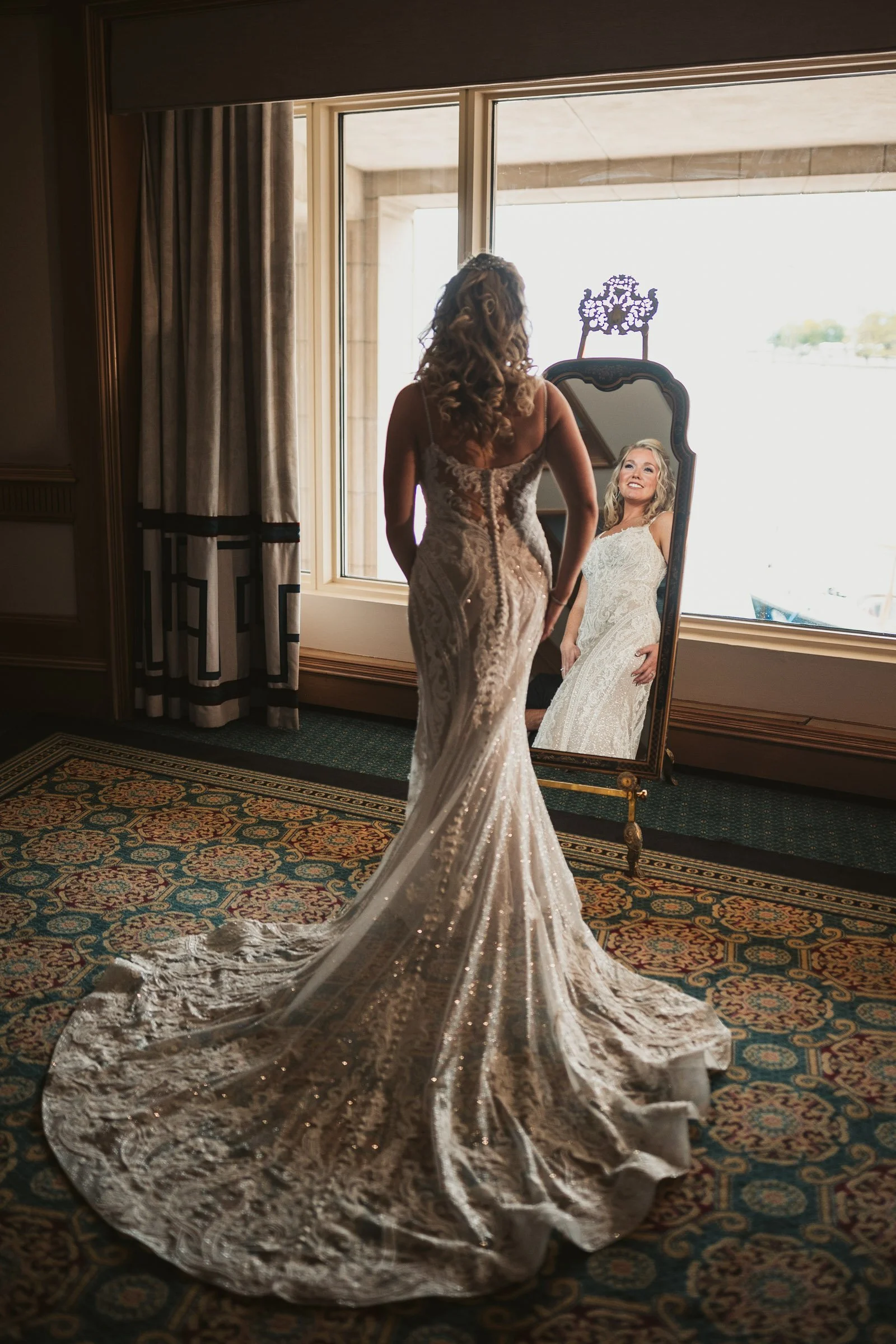 Inside the Massachusetts Room, the atmosphere was filled with excitement as final preparations came together. When the bride stepped into her gown and revealed herself to her bridesmaids for the first time, the room filled with emotion. There were joyful reactions, laughter, and the kind of warmth that comes from years of friendship culminating in a single moment.