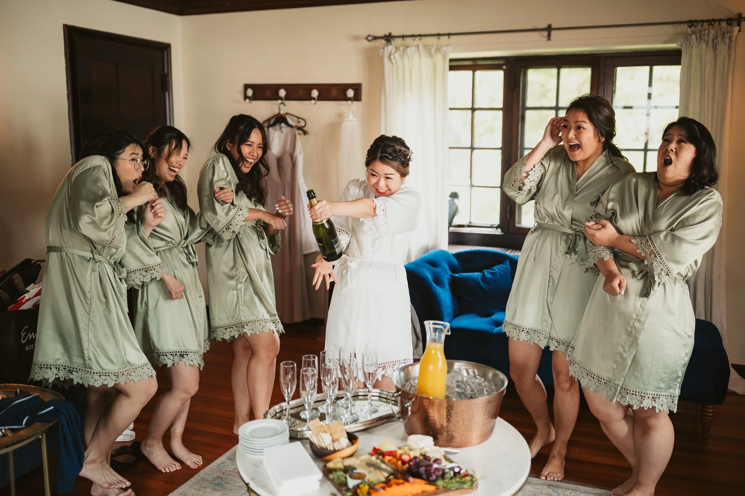 The bridal suite at Willowdale Estate feels more like a beautifully designed historic home than a traditional getting ready space. Large windows fill the room with soft natural light, while warm wood floors and neutral walls create a calm and welcoming atmosphere for the morning preparations.