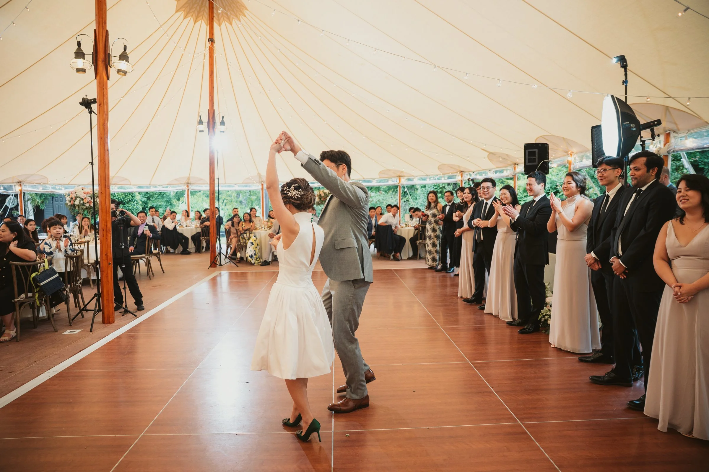As evening arrives, string lights draped across the tent ceiling cast a warm glow across the reception. The wooden dance floor quickly becomes the center of the celebration as guests gather for toasts, dancing, and unforgettable moments throughout the night.