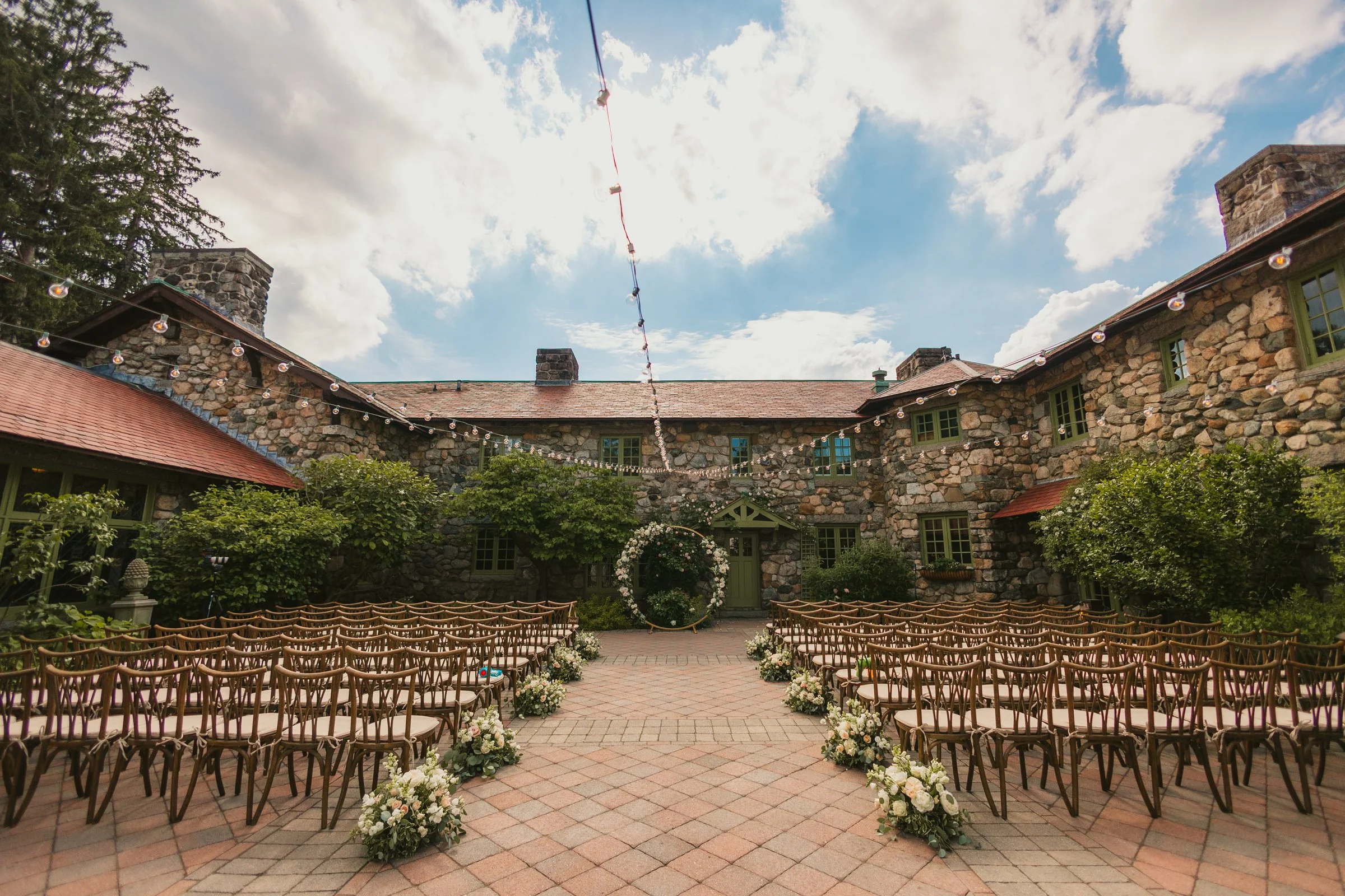 The courtyard ceremony space is the heart of Willowdale Estate weddings. Surrounded by the historic stone mansion and greenery, the courtyard creates an intimate atmosphere while still accommodating larger guest counts.