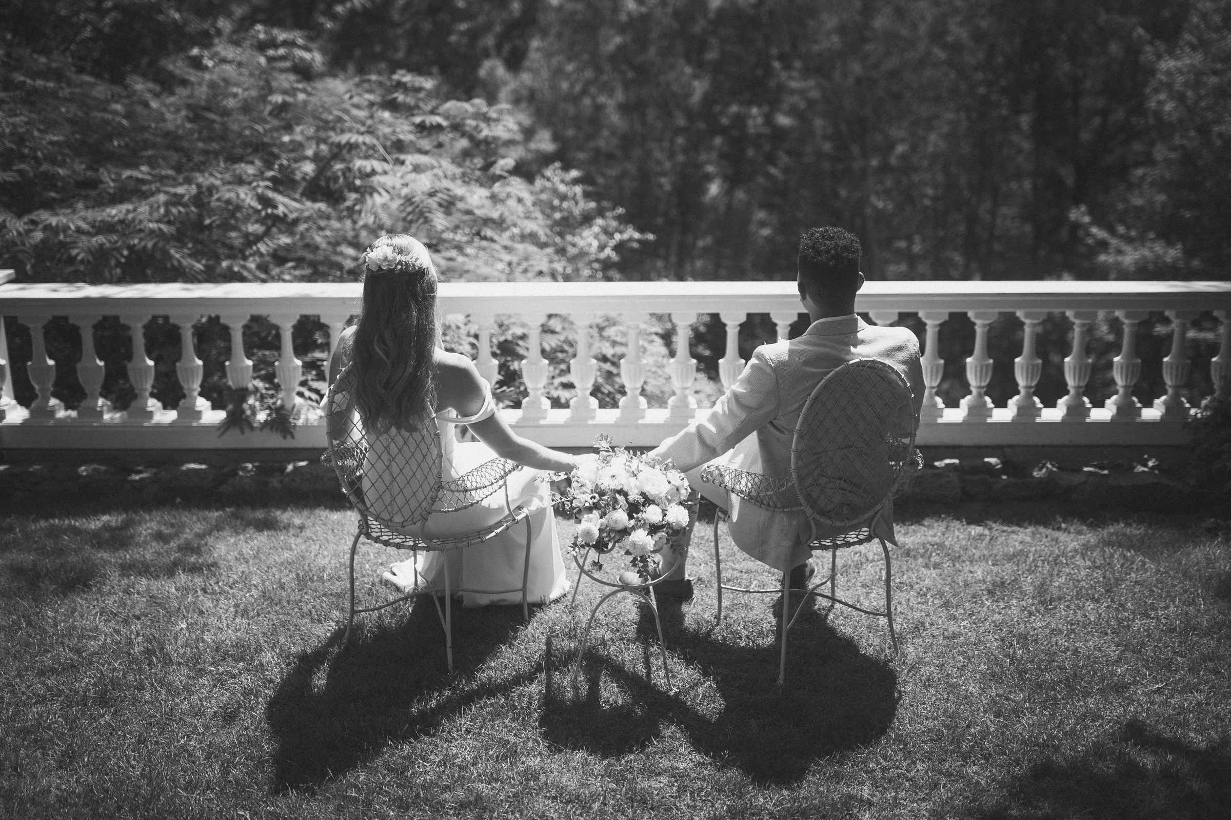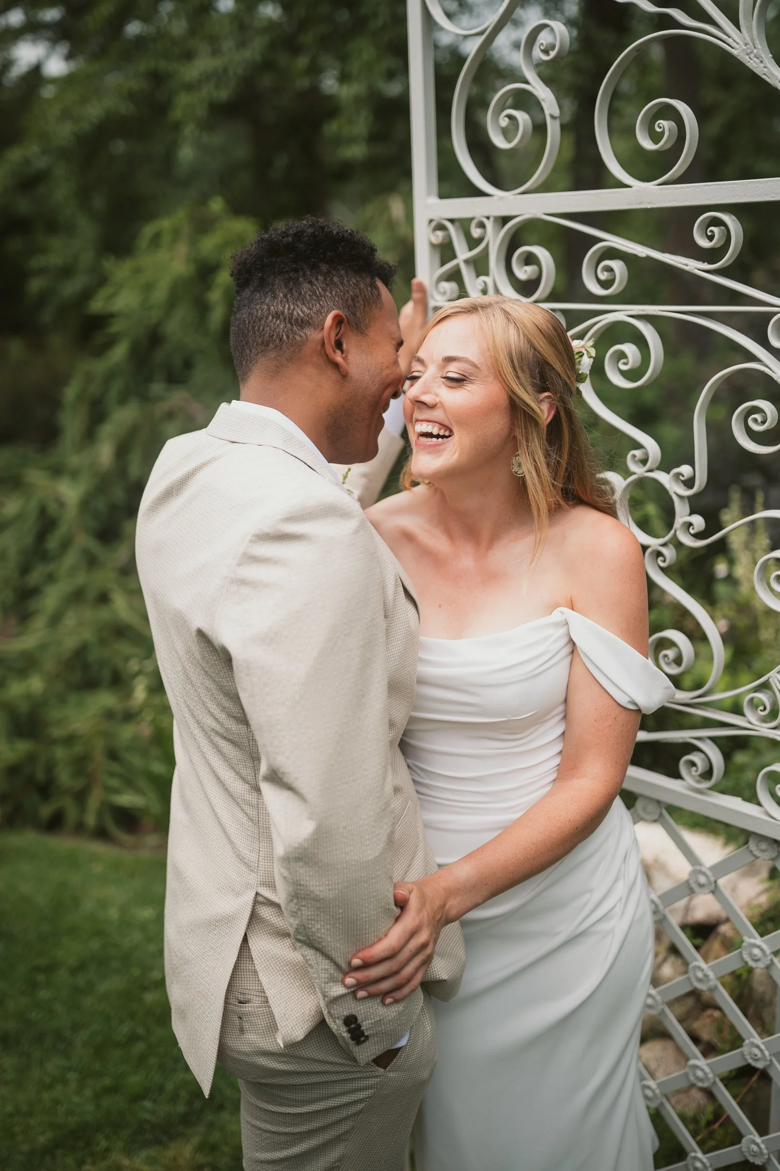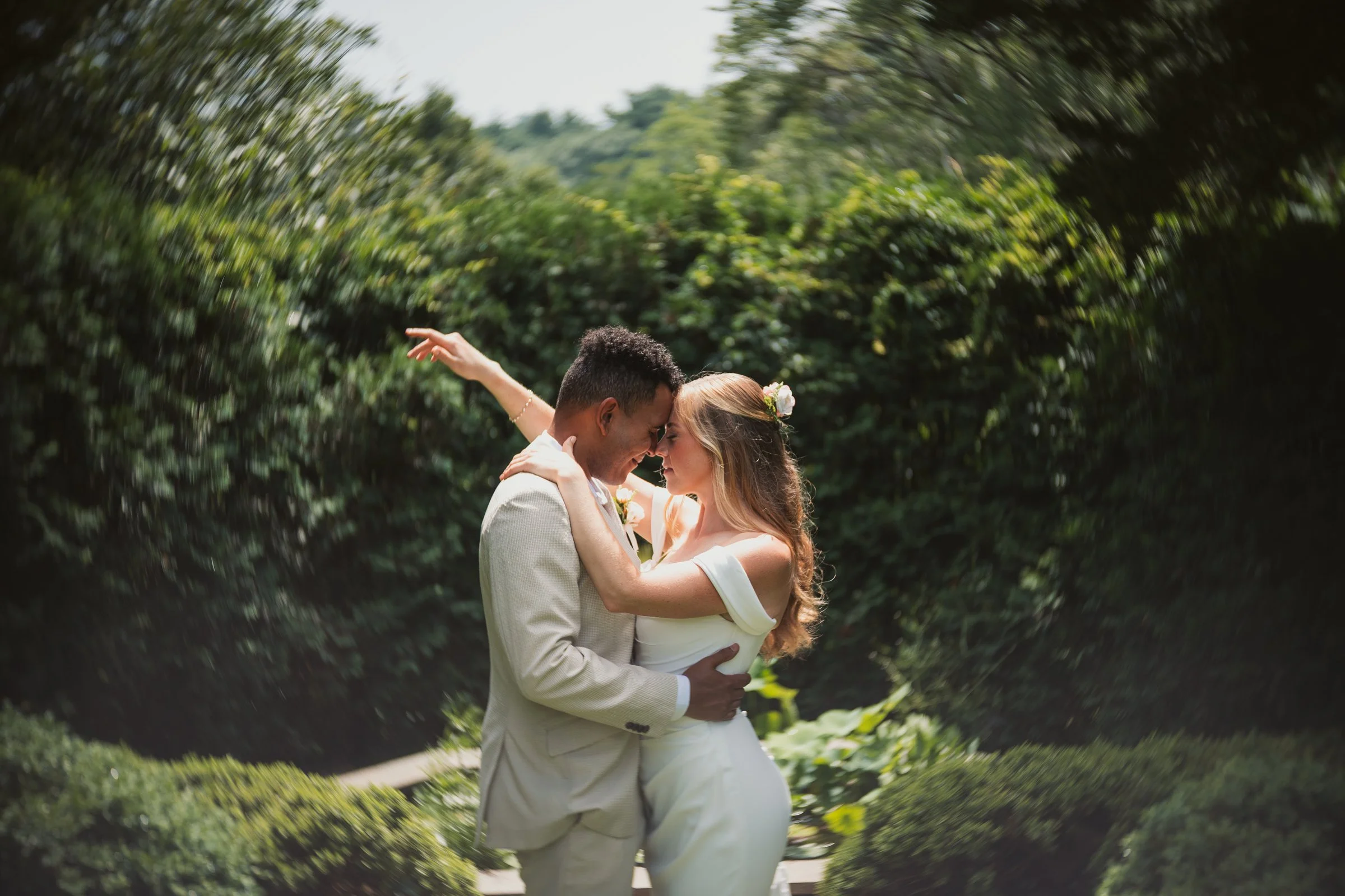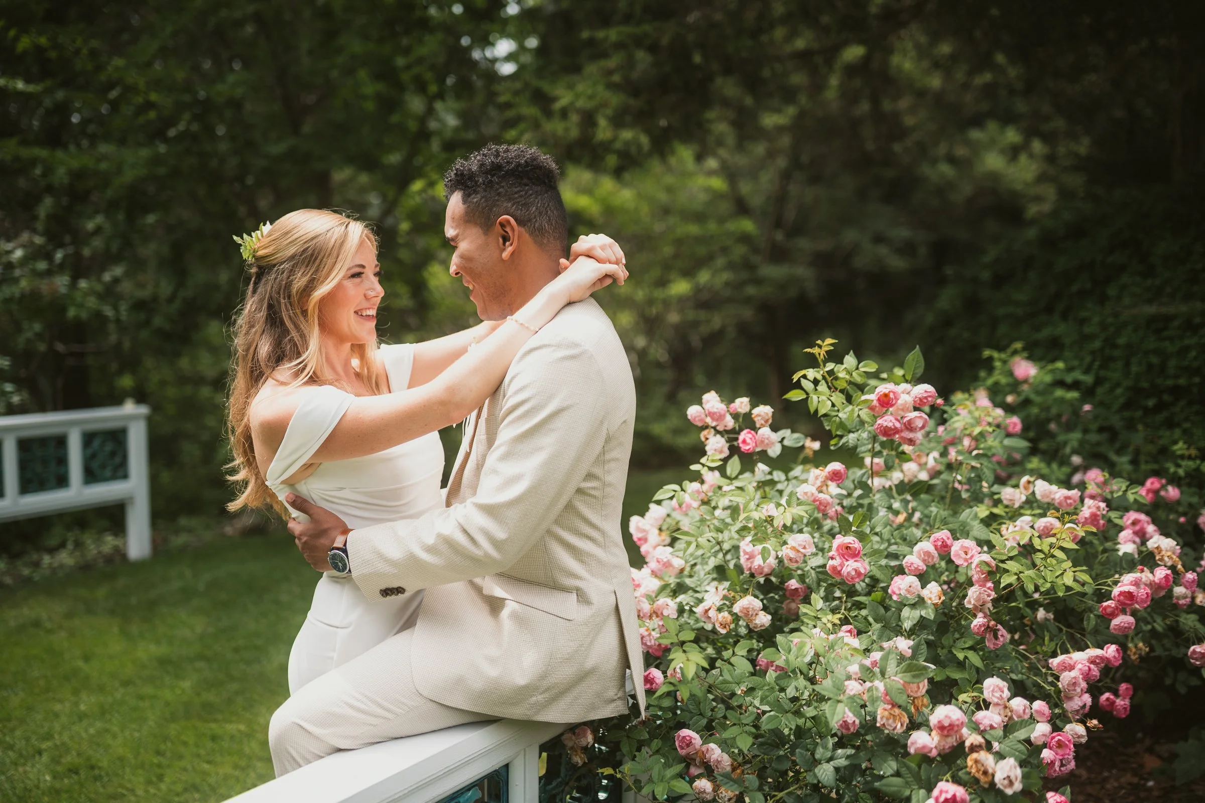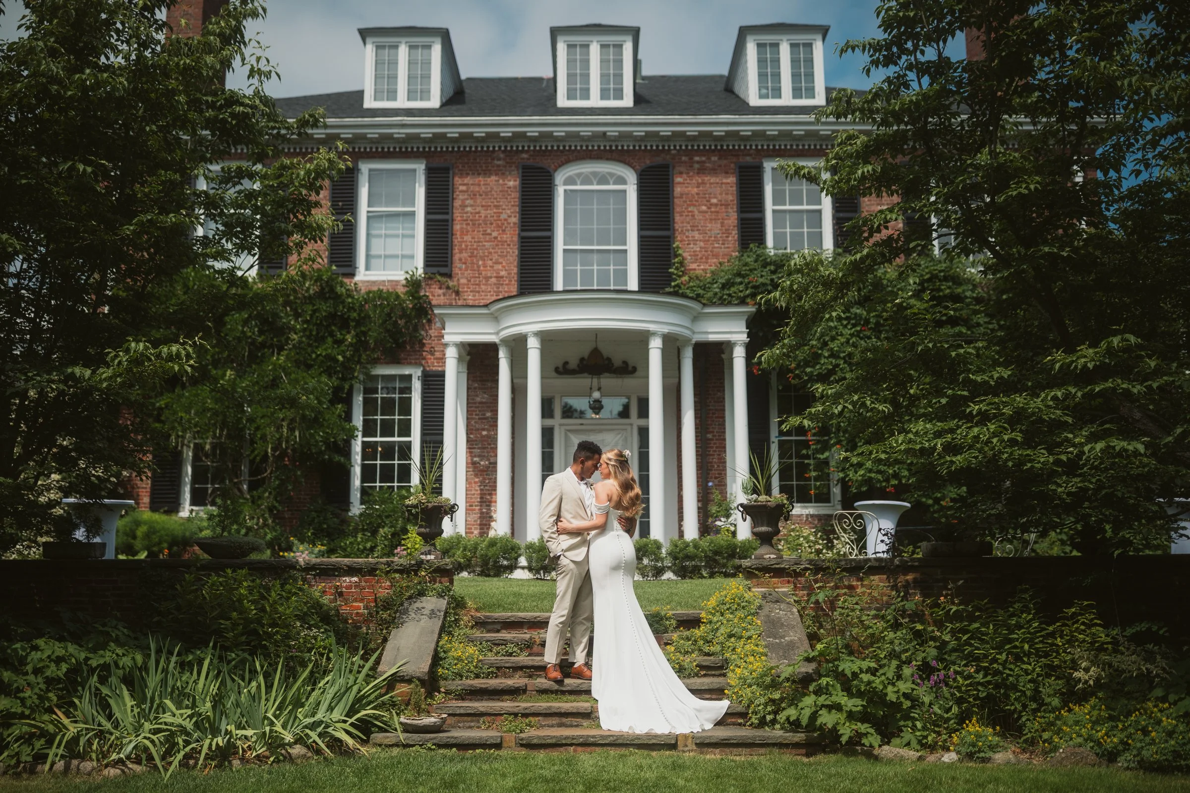 Following the first look, we explored some of Long Hill’s most beautiful portrait locations. We began in the rose garden, where lush greenery and colorful blooms created a soft, romantic atmosphere. The couple relaxed into the moment, allowing their personalities to shine through naturally.