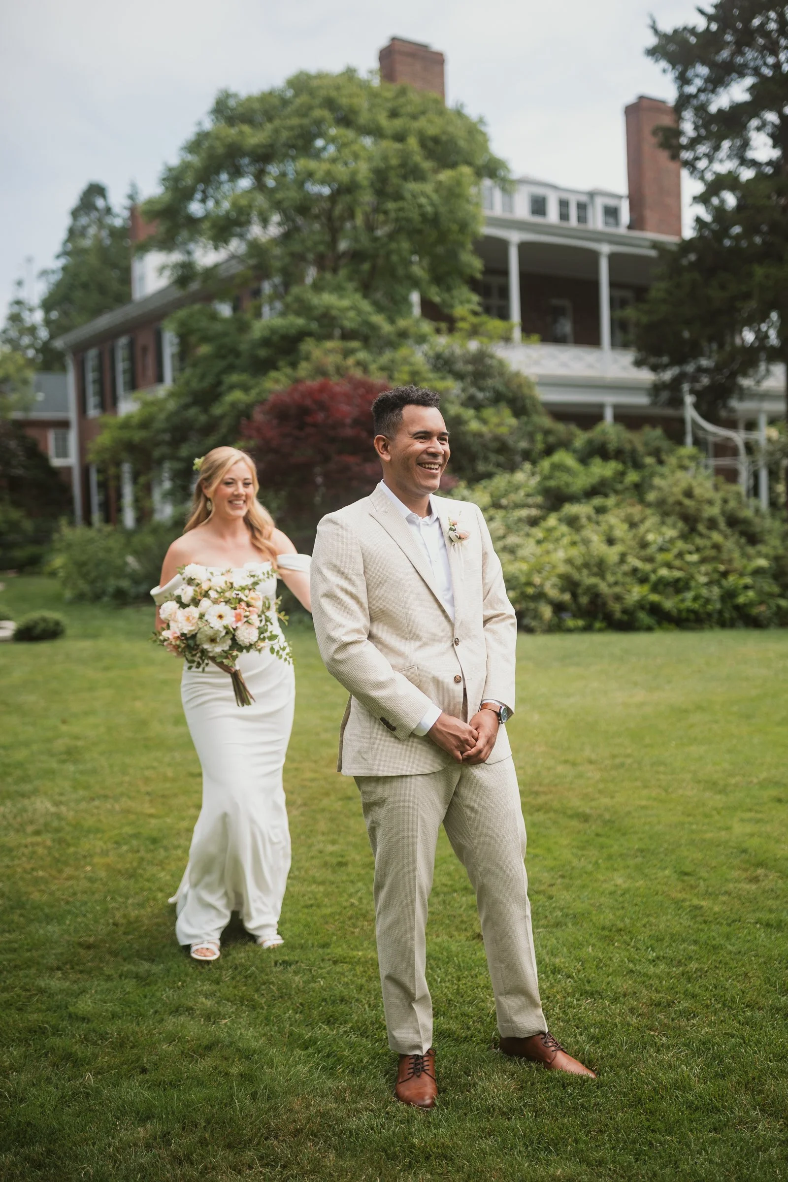 The first look unfolded with the mansion as its backdrop, offering a private pause before the day truly began. There is something incredibly powerful about that anticipation, the deep breath before seeing one another for the first time. As the groom turned around, the emotion was immediate and genuine. In that moment, everything else faded away. Framed by the elegance of Long Hill, their first look became an intimate exchange filled with connection, relief, and excitement for what was to come.
