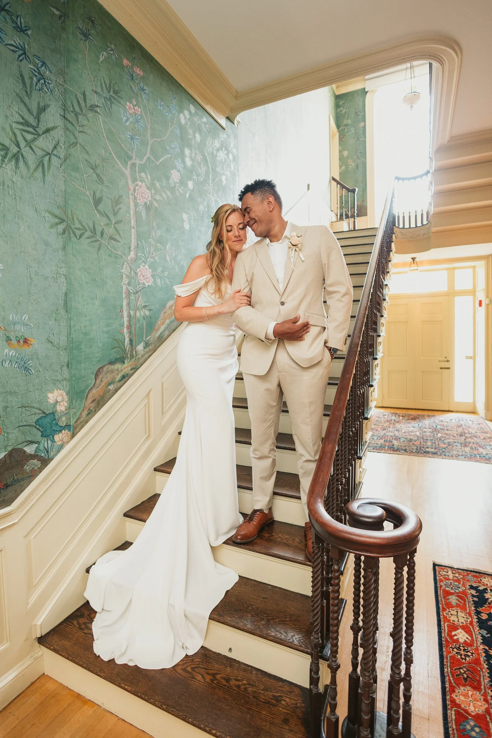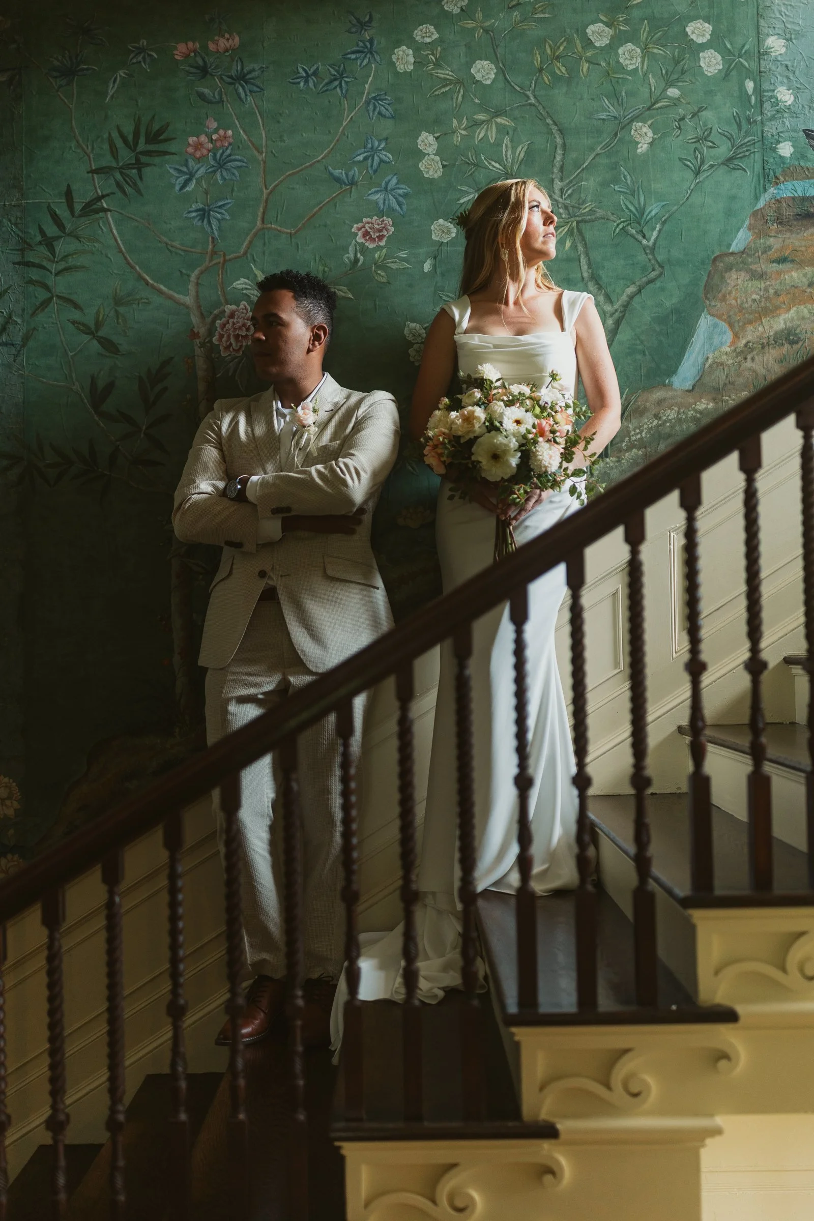 We ended the portrait session inside the mansion at my favorite location, the grand staircase. The hand painted wallpaper and intricate details added a layer of vintage elegance, creating a setting that felt both intimate and cinematic. Together, these locations offered a diverse and cohesive portrait experience that beautifully reflected the couple’s story.