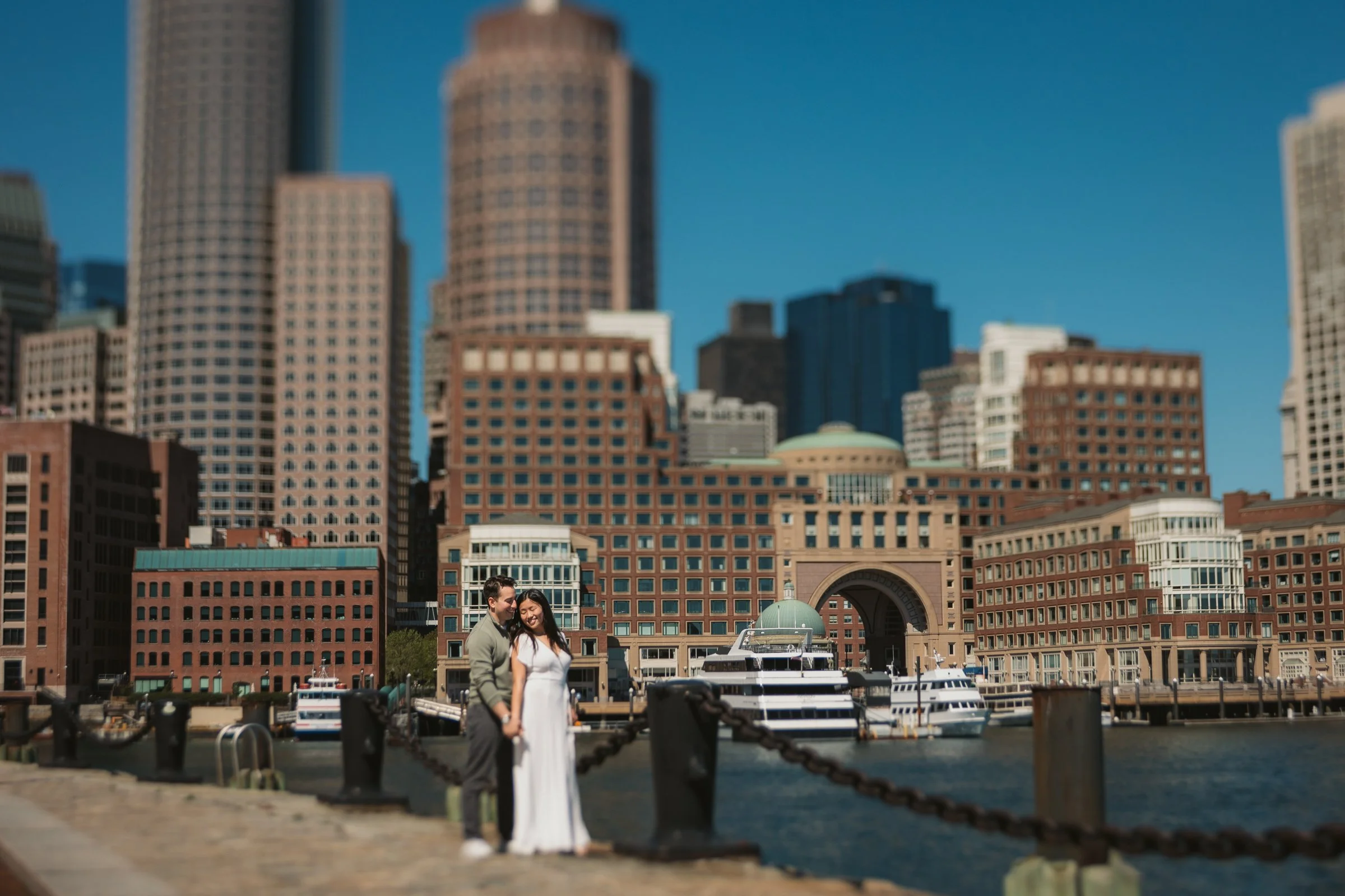 This spot is a great choice for couples who want a classic Boston waterfront look in their engagement photos. The iron chain detail, stone walkway, and harbor edge give the area a timeless nautical feel, while the Boston Harbor Hotel and surrounding skyline add an elegant city backdrop. It also has a long docking area that opens up to beautiful water views, giving the session a more spacious and scenic feel. It works especially well for couples who want images that feel polished, romantic, and distinctly Boston, all in one location.