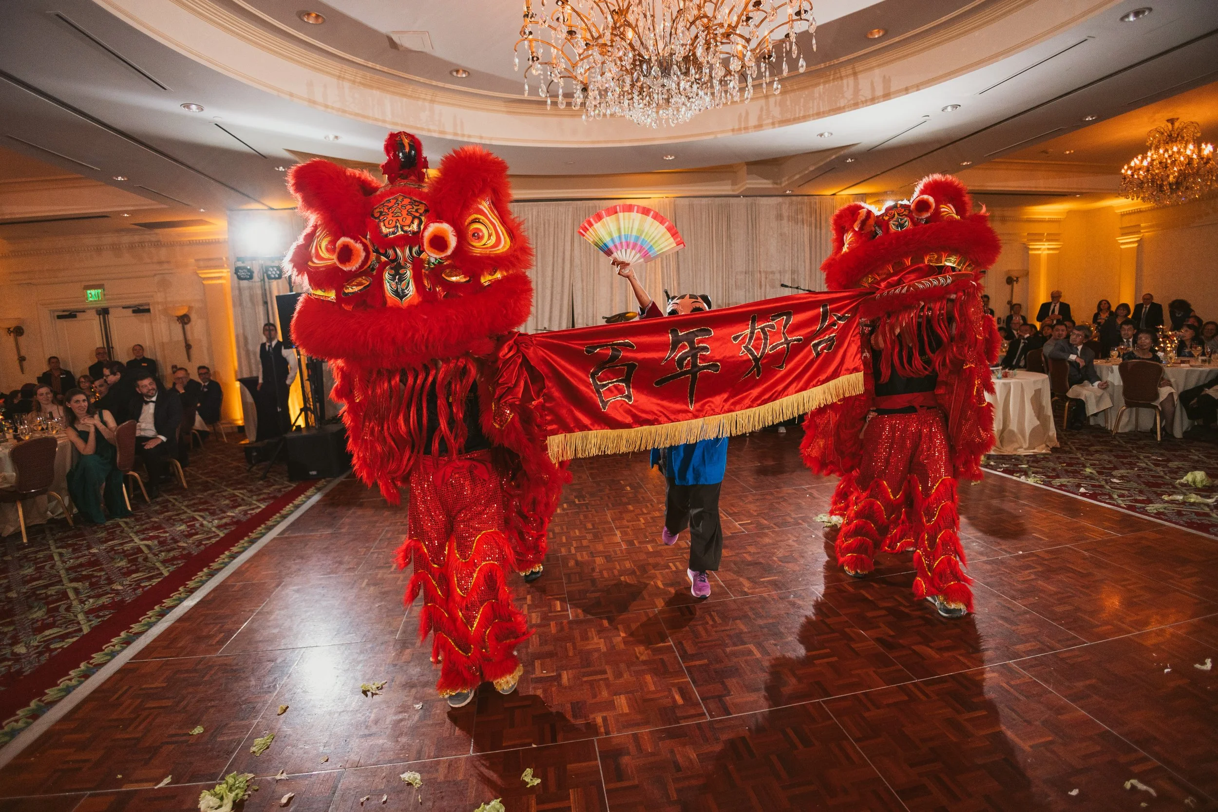 As the reception began, a vibrant red lion dance burst onto the dance floor beneath sparkling chandeliers, its rhythmic drums symbolizing prosperity and good fortune for the newlyweds. If you are curious about the deeper meaning behind the lion dance and other traditional elements, you can read more in my Chinese and Vietnamese Wedding Traditions Guide.