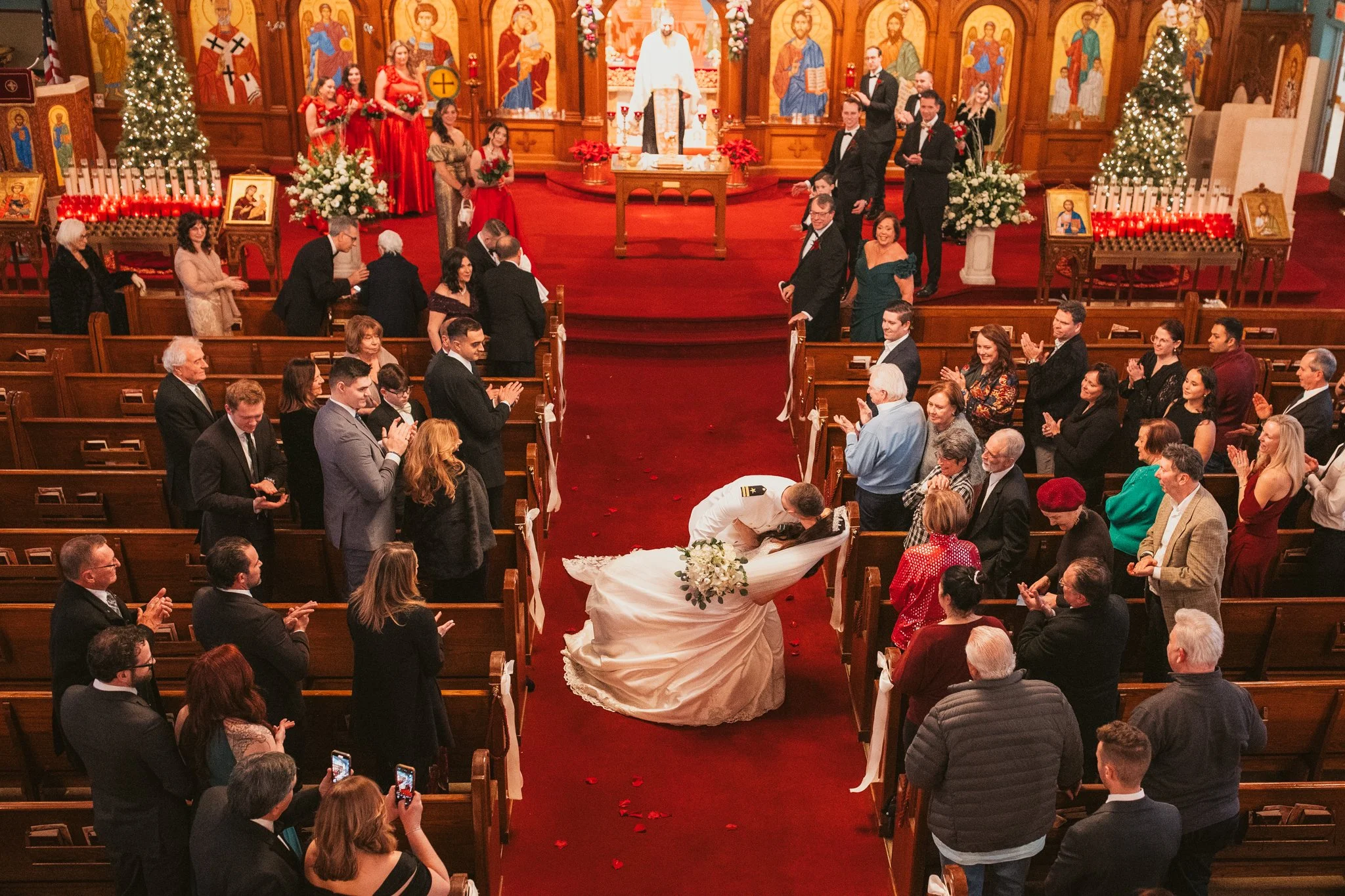 Anna and Christopher exchanged vows at St. George Greek Orthodox Church in Lynn, a venue known for its extraordinary architectural detail and spiritual significance. The interior, adorned with intricate iconography, glowing chandeliers, and rich textures, provided a breathtaking setting for their ceremony.