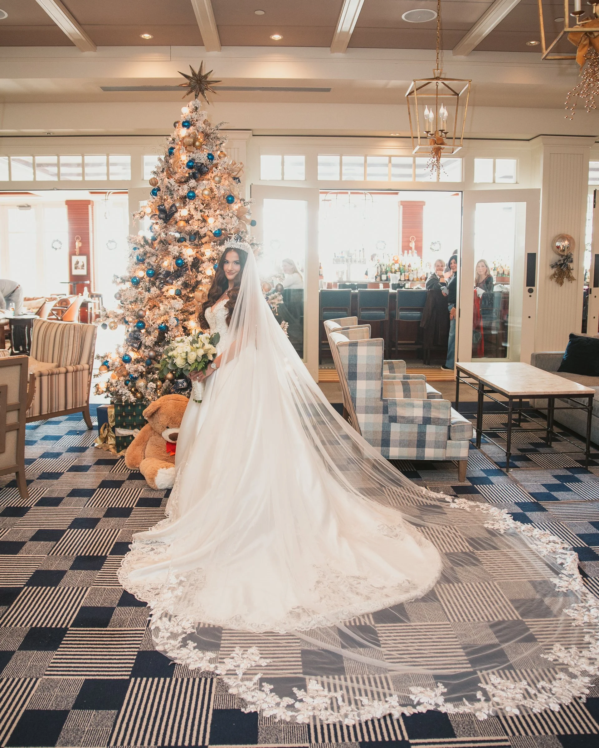 For winter weddings at Cruiseport, the key is to stay close to the venue and make the most of what’s just steps away. We rotated through Cruiseport’s best portrait spots without needing to travel. The grand front entrance gave us a bold architectural look, the patio offered quick harbor views under the winter sky, the dining hall under the chandeliers added a touch of timeless elegance, and the fireplace area created portraits with a classic, intimate feel that never goes out of style.