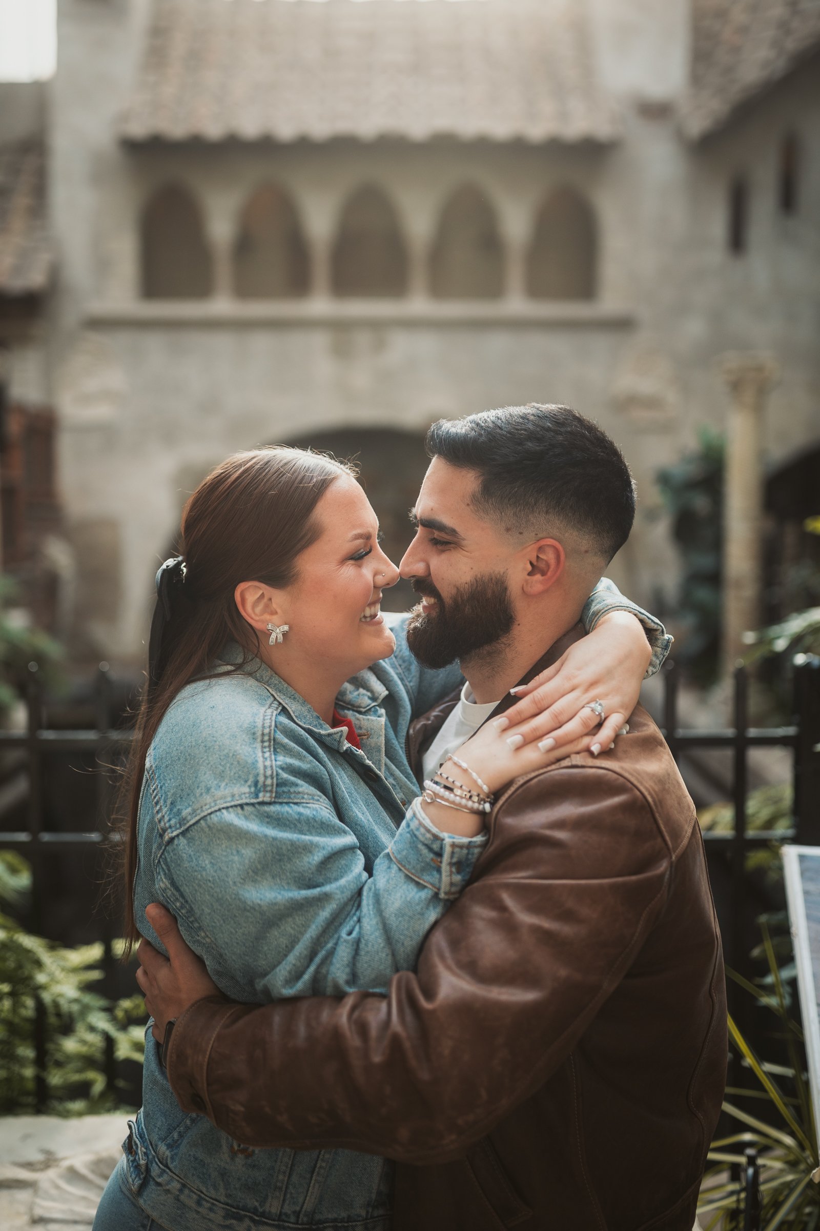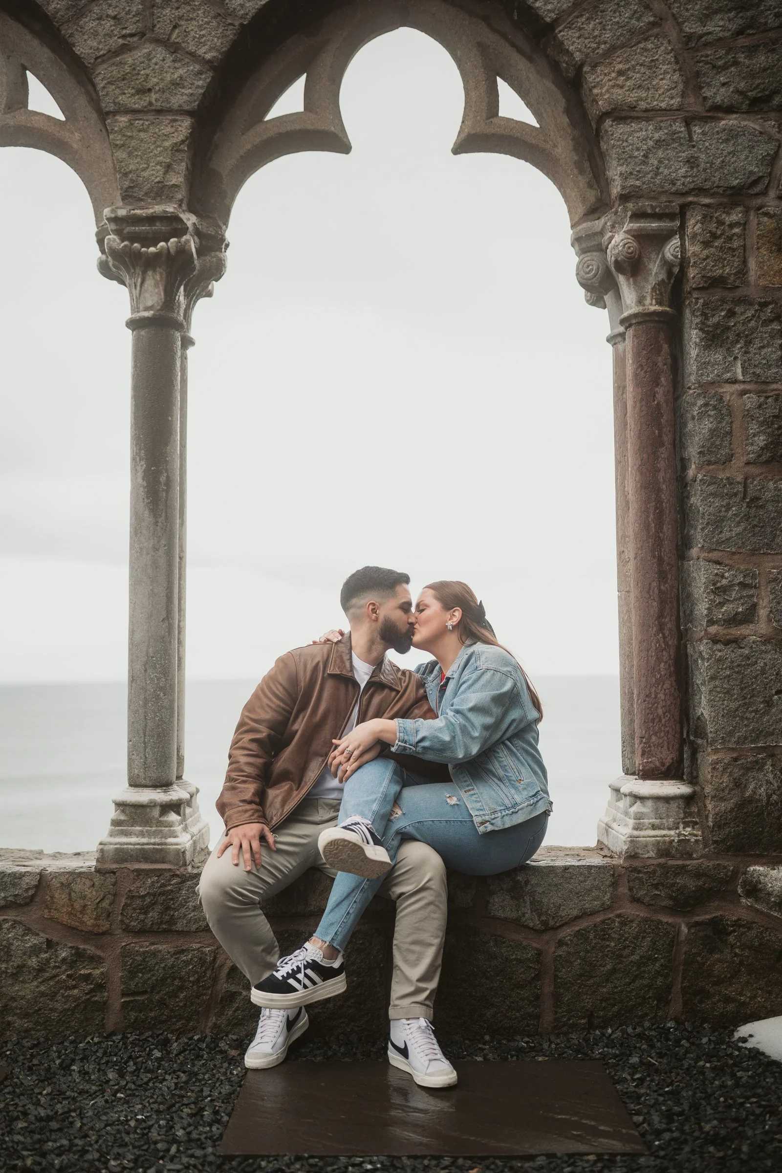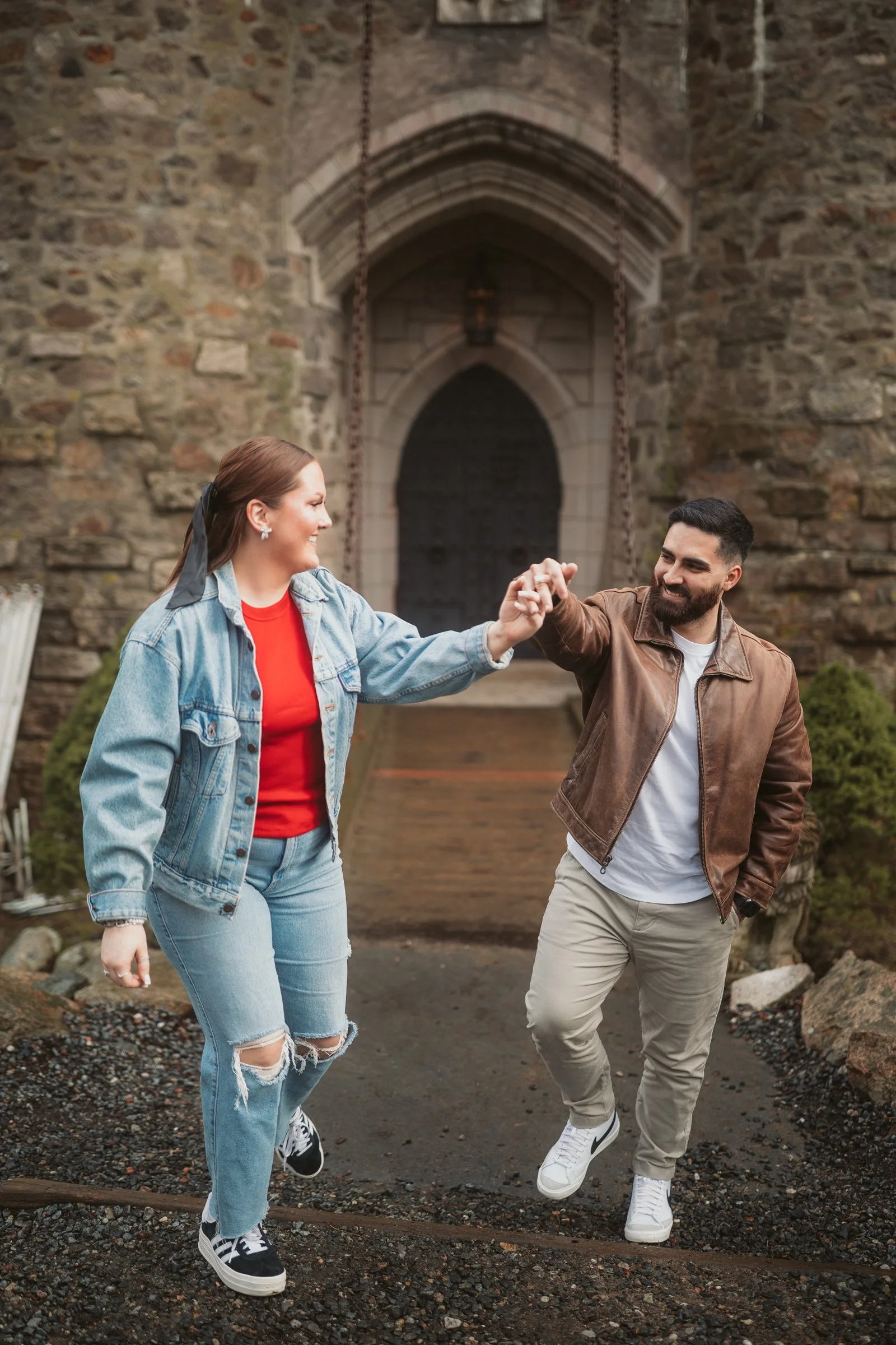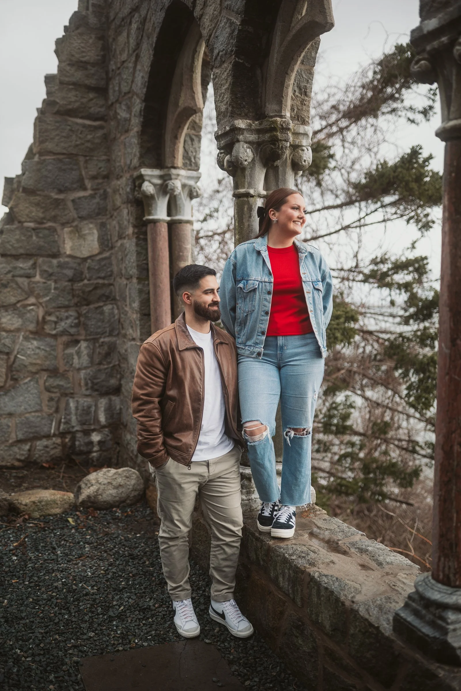 After their proposal, I took the couple around Hammond Castle for a relaxed portrait session, weaving through some of its most iconic spaces. From the stone arches overlooking the coastline to the historic drawbridge, the dramatic Great Hall, and the intimate circular library, each setting added its own sense of romance and timeless character. The experience felt natural and unhurried, allowing them to savor the moment while I captured their genuine connection within the castle’s storybook setting.