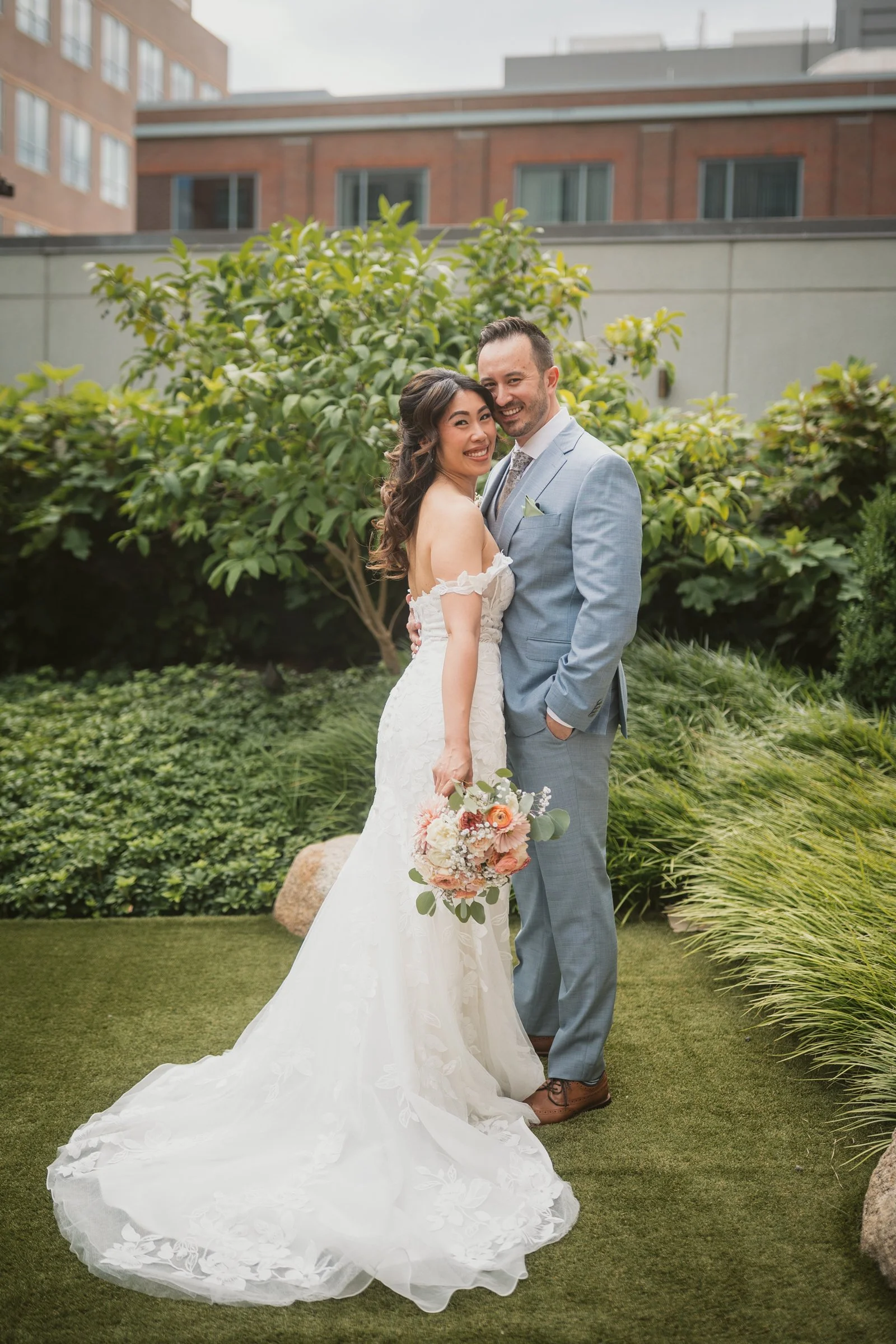 After the first look, we headed to University Park Commons for portraits. The clean lines, open green spaces, and urban backdrop offered the perfect contrast to the intimacy of the morning. Kimberly and Greg were relaxed, playful, and fully present with each other, making this portrait session feel effortless. The setting gave their photos a modern, editorial feel while still feeling warm and romantic.